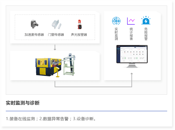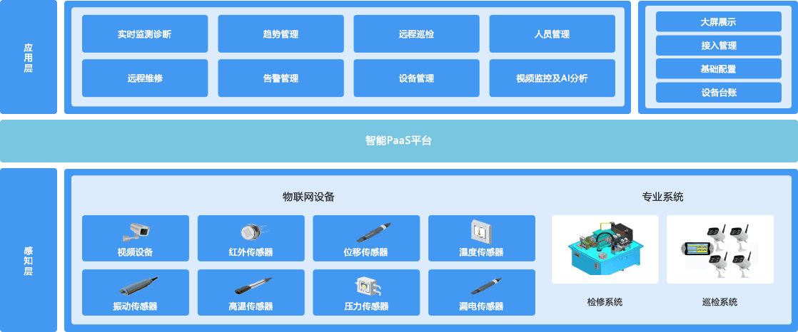 通过将物联网、边缘计算、大数据等先进技术和工厂生产装备运行监测有机结合,针对生产装备常见故障和安全隐患等可靠性风险点,进行实时监控和状态告警,趋势分析和故障预判、远程诊断和远程检修,实现精准、高效、低成本的生产装备运行和维护检修工作,提高装备可靠性。