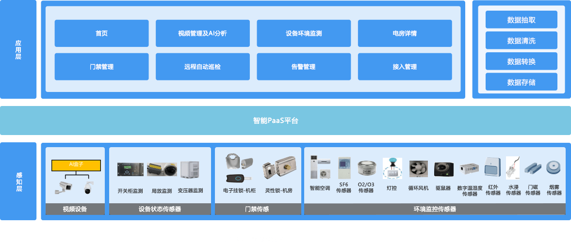 创新性地将AI分析、物联网、边缘计算、大数据等技术和配电房生产、安全有机结合,针对配电房生产、安全要求,提供一套针对配电房运行远程实时监控、智能分析和应急管理的解决方案。